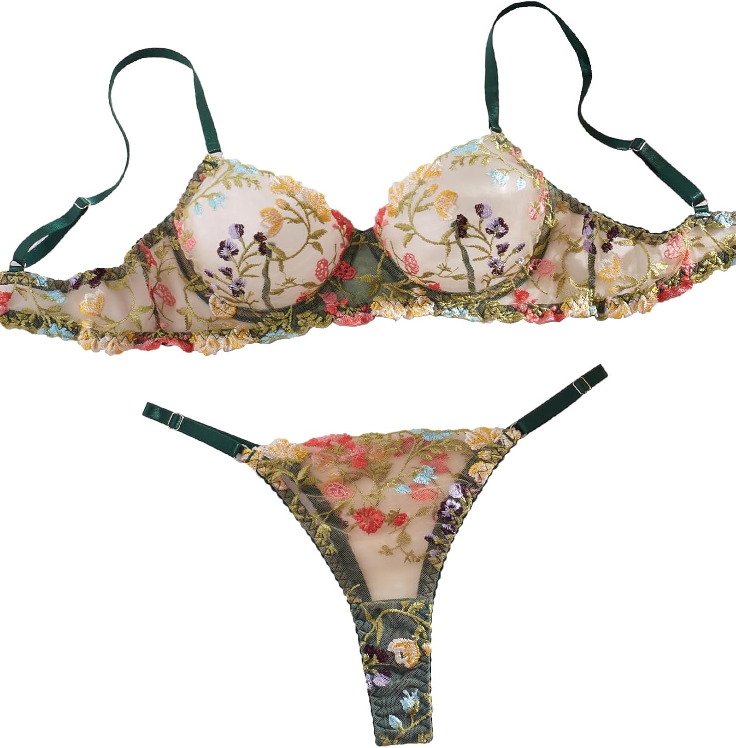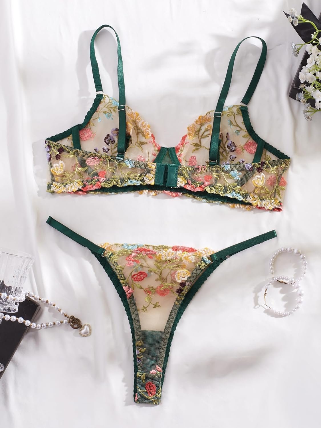 Sexy Floral Embroidered Flower Mesh Underwire Push Up Lingerie Set
